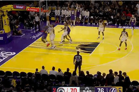 第三節比賽中,巴茨別拋詹姆斯面對祖巴茨左右手分別拋投打進(jìn),投打湖人領(lǐng)先8分打??齑?。進(jìn)湖