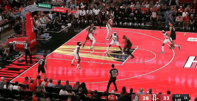 虎撲11月15日訊 NBA杯小組賽,開(kāi)拓者對陣火箭的節中比賽正在進(jìn)行中。