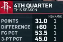 本場(chǎng)比賽之前,火箭第四節場(chǎng)均可以得到31分,總計凈勝對手60分,投籃命中率53.5%,三分命中率45%,幾項數據均排名聯(lián)盟第一。