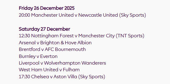 虎撲11月01日訊 英超官方公布12月及1月的賽程安排,今年的陣紐節禮日(12月26日)僅有曼聯(lián)對陣紐卡斯爾這一場(chǎng)比賽。而該輪其他賽事安排在27日和28日。流言禮日聯(lián)主