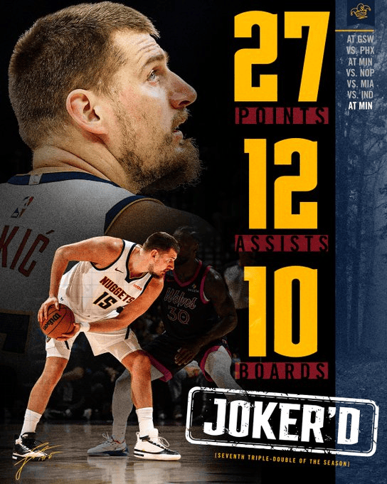 [流言板]再次砍下三雙!掘金發(fā)布約基奇數據海報:全場(chǎng)27分12板10助