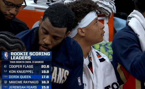 比賽的新秀第二節,轉播畫(huà)面給出一組數據,得分內容為12月至今新秀球員場(chǎng)均得分榜單(出戰超過(guò)三場(chǎng)比賽),場(chǎng)均詳情如下: