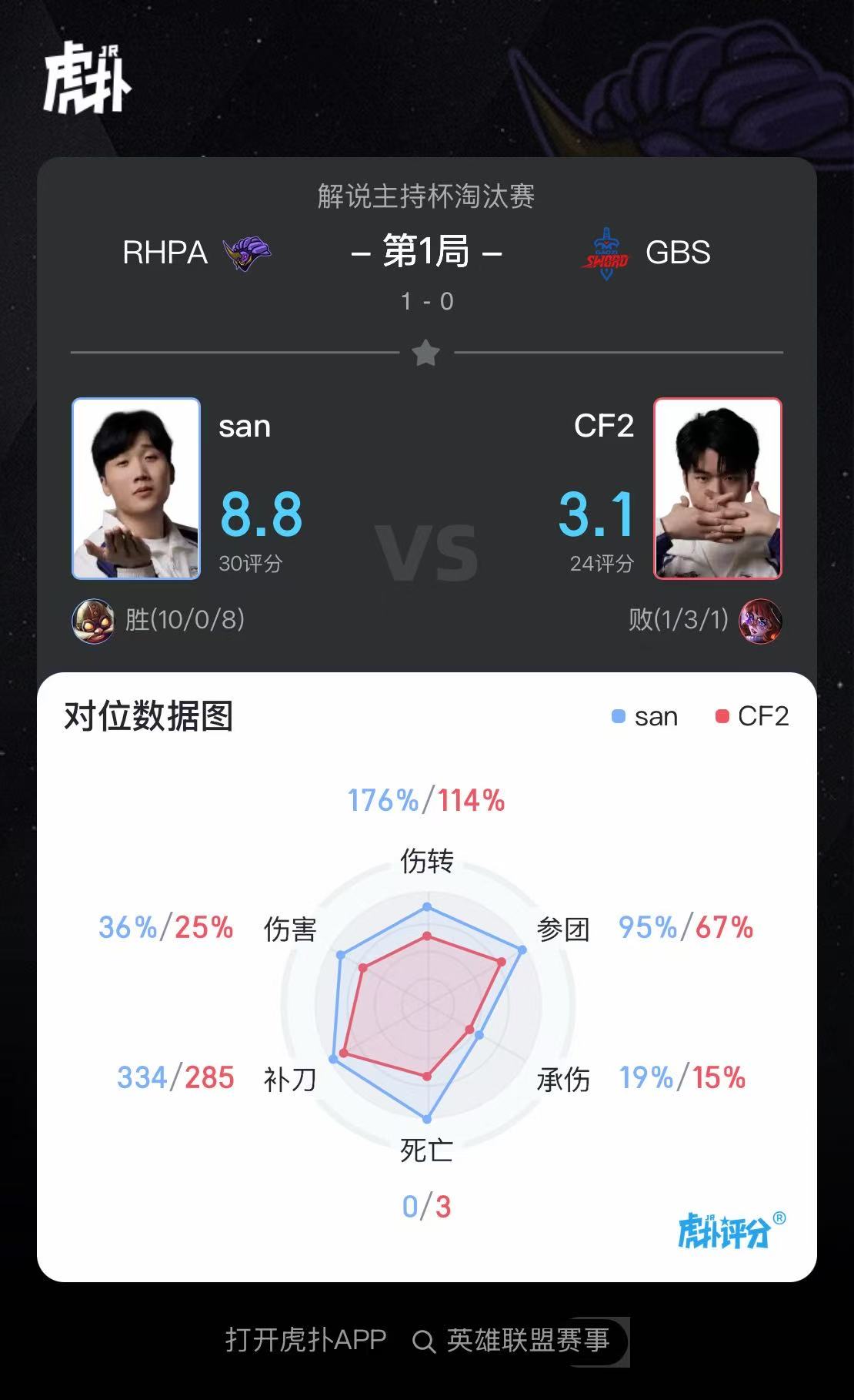 [流言板]san飛機打出10/0/8戰績(jì),飛機斬獲RHPA對陣GBS第一局MVP由虎撲游戲電競資訊 發(fā)表在英雄聯(lián)盟 https://bbs.hupu.com/lol