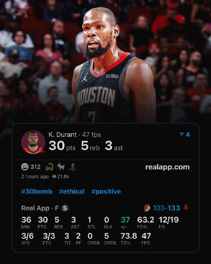 火箭隊首發(fā)五人達到了恐怖的境地,特別是杜蘭特!今天要點(diǎn)名夸贊這位老將,他的進(jìn)攻節奏和傳球細節,更好的融入了球隊體系,并且kd防有球三分的能力,真的很強悍。很多回合你可以看見(jiàn),當kd防守對方投三分的時(shí)候,對面會(huì )投出三不沾這樣的場(chǎng)面。繼續保持!有時(shí)候你需要對狀態(tài)良好的老將給出夸贊,因為那并不容易!