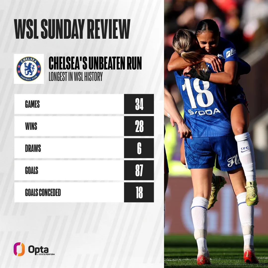 據Opta數據統計,本場(chǎng)過(guò)后,藍軍在英格蘭女足超級聯(lián)賽中已經(jīng)連續34場(chǎng)不?。?8勝6平),成為WSL歷史上首支、也是唯一一支完成34場(chǎng)聯(lián)賽不敗的球隊,正式刷新由自己保持的紀錄。