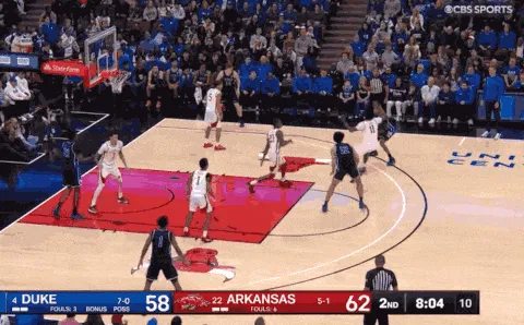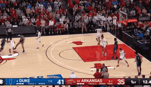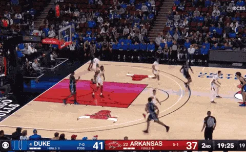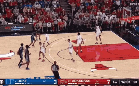 阿肯色前鋒特雷馮·布拉齊爾(7號Trevon Brazile)在擠掩護方面做得不錯,但當他回防到布澤爾面前時(shí),杜克球星使出了他的一招慣用技:倚靠左肩轉身,并在油漆區內雙腳起跳。布澤爾或許本該直接尋求得分,但見(jiàn)馬利克·尤因(12號 Malique Ewin)前來(lái)補防,他轉而找到禁區內的恩貢巴,但后者的上籃偏得離譜。