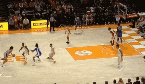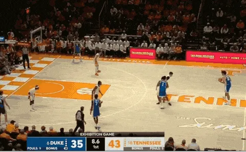 在諾克斯維爾的上半場(chǎng)最后一攻中,杜克通過(guò)為布澤爾設計的逆向配合直接得分。藍魔在上半場(chǎng)結束前擺出小陣容,將布澤爾推上5號位。他選擇放棄為福斯特做掩護,使得防守人始終貼在他身前。雖然防守十分到位,但道高一尺魔高一丈:布澤爾在中距離依舊能找到了節奏,命中了一記運球后的高難度跳投。