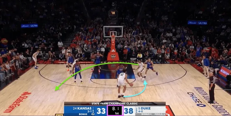 根據我的記錄,杜克在感恩節逆轉戰勝阿肯色的比賽中,與布澤爾執行了四次逆向配合,第一次來(lái)自杜克的另一個(gè)次要進(jìn)攻體系“Flow”中的起手式。凱登·布澤爾將球傳給左翼的弟弟。當卡姆開(kāi)始突破時(shí),埃文斯位于肘區附近,實(shí)質(zhì)上進(jìn)行了一次逆向的幽靈掩護,從卡特·諾克斯(11號 Karter Knox)身下溜過(guò),并在45度外彈得到空位。布澤爾再次找到了他,隨即出手了一記受干擾極小的接球投三分。