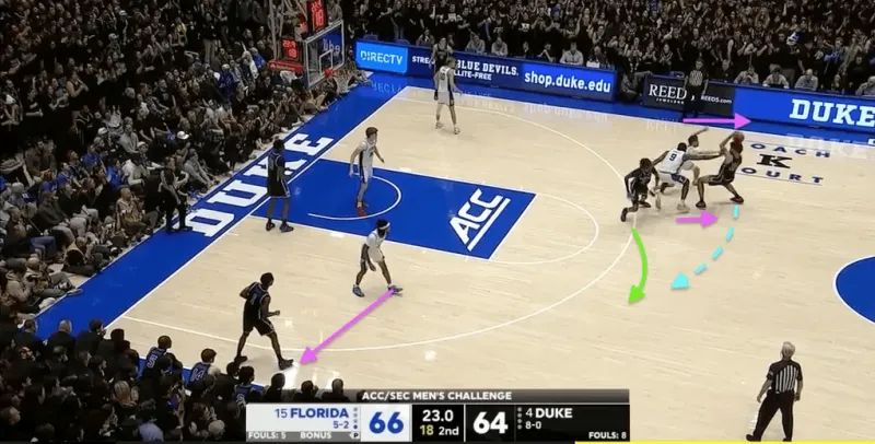 隨著(zhù)埃文斯為布澤爾設置掩護,佛羅里達的防守被迫要在兩瓶毒藥中選一瓶:若鱷魚(yú)隊選擇換防,身材小得多的克拉夫扎爾將不得不對上布澤爾,那便給了杜克一個(gè)勢在必得的錯位優(yōu)勢,同時(shí)埃文斯可以將一名證明過(guò)自己的護框者調離油漆區;若克拉夫扎爾上前延誤并撲向布澤爾,他就會(huì )讓埃文斯從反方向溜走并擺脫,防守也會(huì )露出破綻。