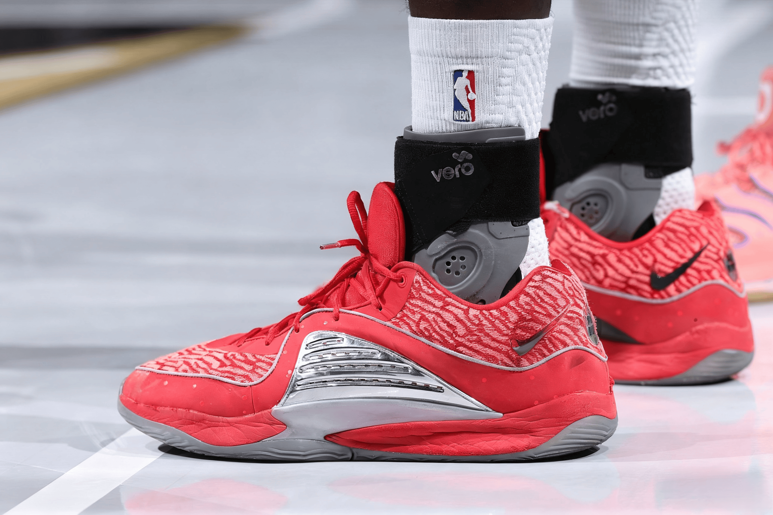比賽中,流言倫穿杜倫上腳紅銀色Nike KD16。板杜板搶
