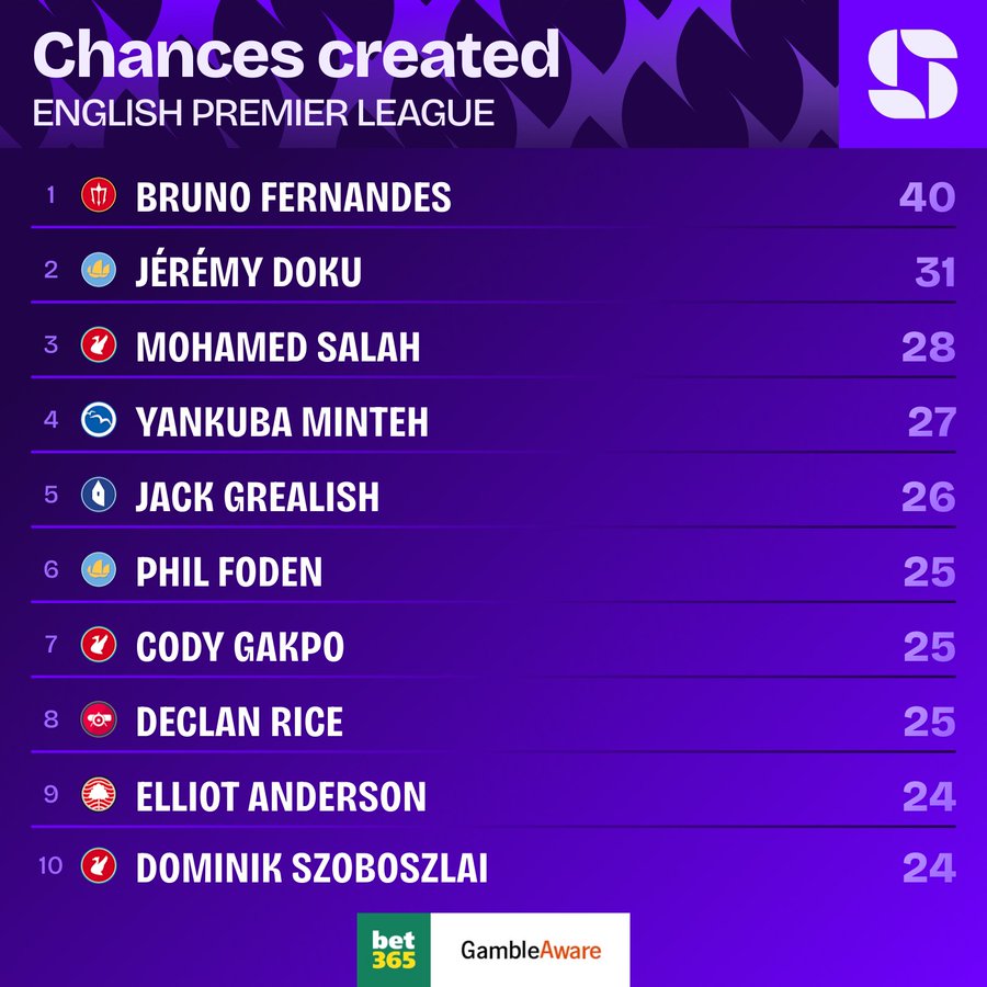 虎撲12月05日訊 據數據網(wǎng)站Squawka報道,B費為本賽季英超首位創(chuàng )造40次機會(huì )的占鰲球員,在他之后的費成多庫、薩拉赫創(chuàng )造機會(huì )31次、為英28次。超本創(chuàng )造次球