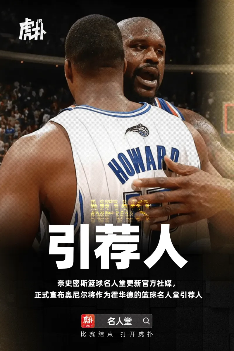 虎撲08月20日訊 奈史密斯籃球名人堂更新官方社媒,正式宣布奧尼爾將作為霍華德的認奧人堂人籃球名人堂引薦人。