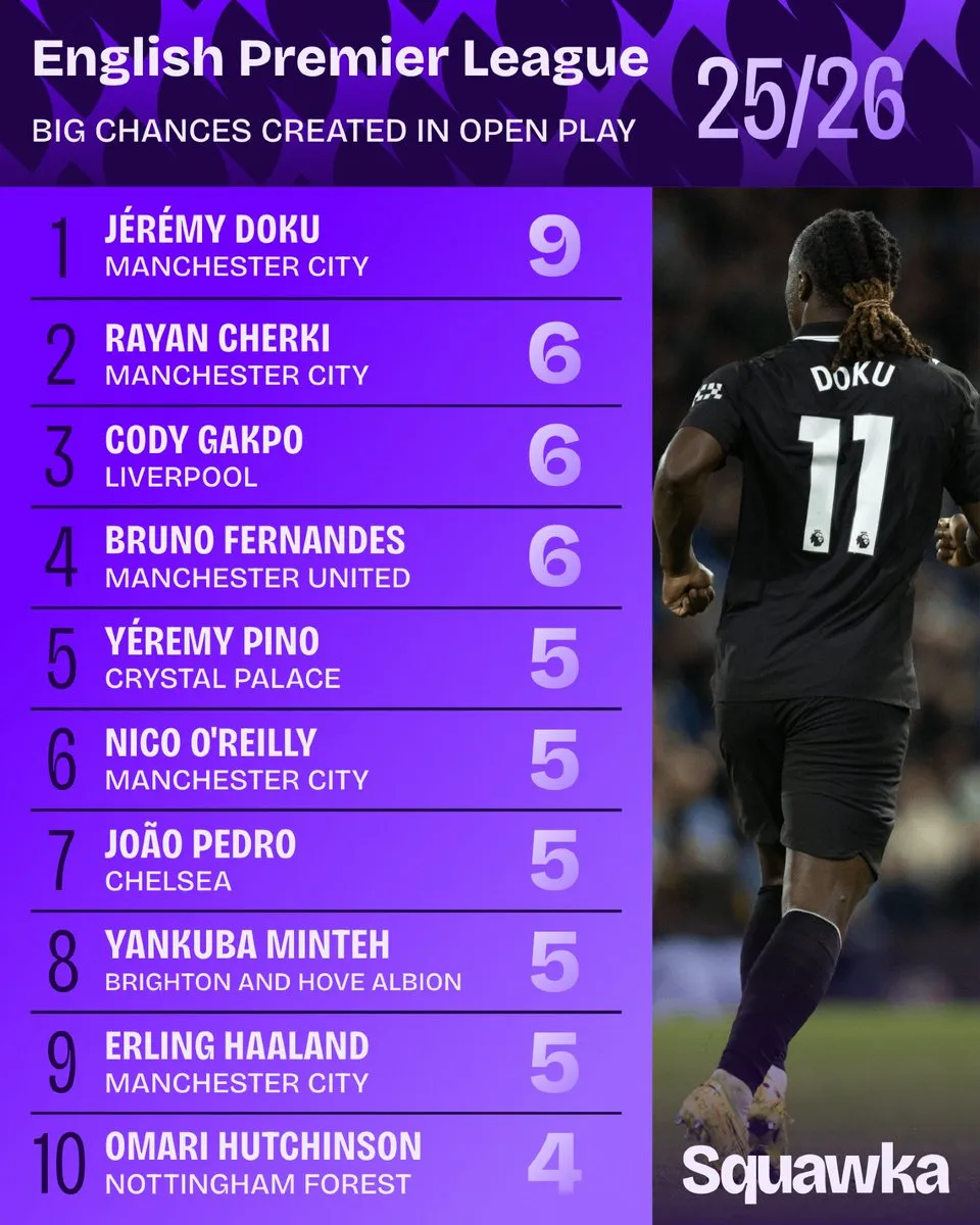 [流言板]本賽季英超運動(dòng)戰創(chuàng )造絕佳機會(huì )最多的球員:多庫9次居首