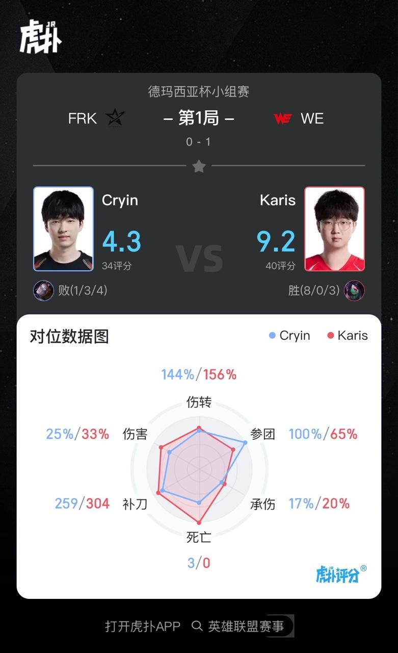 虎撲12月15日訊 在剛剛結束的WE對陣FRK的比賽中,Karis使用阿卡麗打出8/0/3戰績(jì),對第局斬獲WE對陣FRK第一局MVP