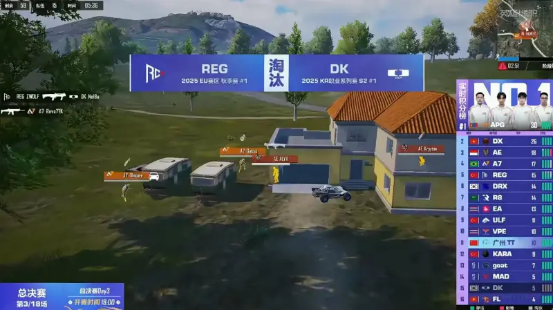 DK先倒一人選擇接架,但在房區內配合不佳,REG直接淘汰DK