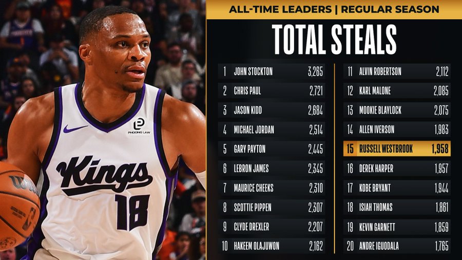 [流言板]威少生涯總搶斷數超越哈珀,升至歷史搶斷榜第15位