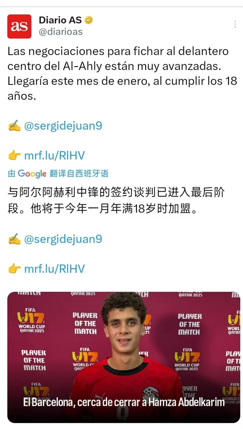 阿斯報:巴塞羅那即將完成對年輕前鋒哈姆扎·阿卜杜勒·卡里姆的簽約。