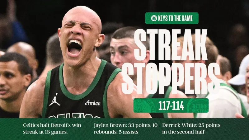 “我們終止了活塞隊史紀錄的13連勝,同時(shí)我們還戰勝了東部第一,取得了一場(chǎng)酣暢淋漓的勝利??!”凱爾特人官方附文道。