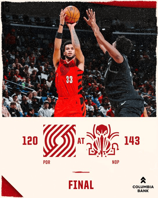 虎撲12月12日訊 今日NBA常規賽,鵜鶘143-120戰勝開(kāi)拓者。官方