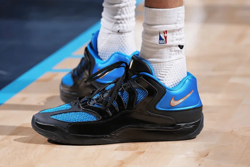 比賽中,流言倫穿藍色霍姆格倫上腳黑藍色Nike KD18 PE。板霍板助