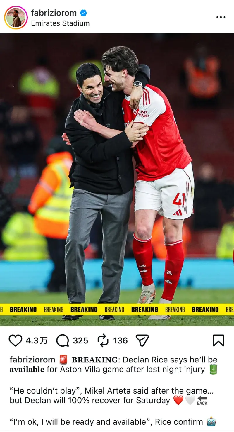 賴(lài)斯確認沒(méi)受傷,周末踢維拉可以上場(chǎng)!