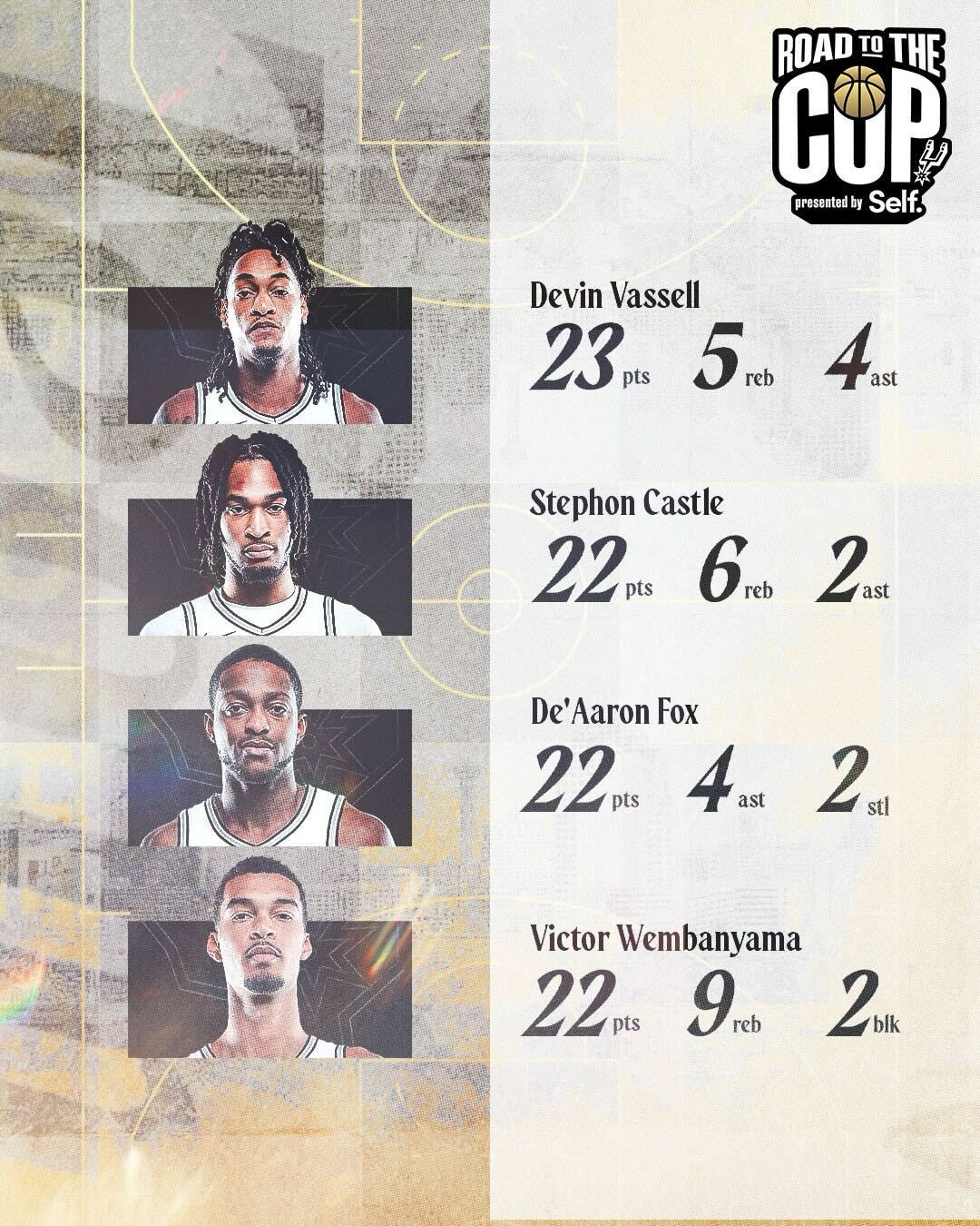 在昨日的NBA杯半決賽中,馬刺全隊四人得分上20,分別是23分的瓦塞爾和22分的卡斯爾、文班、??怂?。
