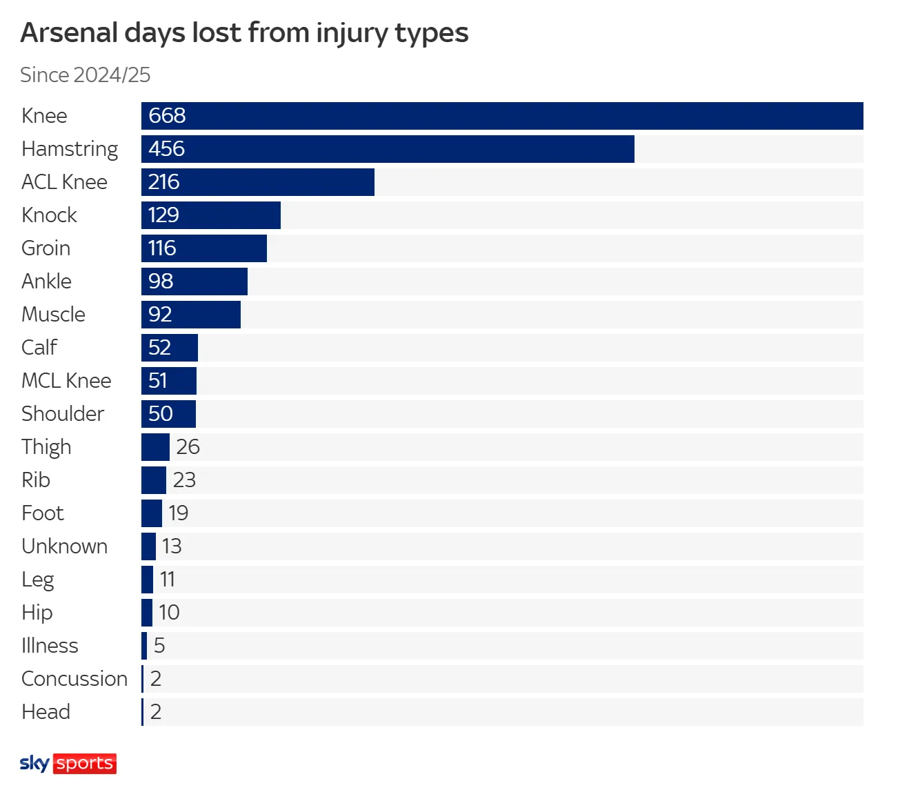 從傷病類(lèi)型來(lái)看,膝蓋傷勢對阿森納影響最大,自2024年8月以來(lái)已導致球員累計缺席668天。此外,腿筋傷病造成458天缺陣,而ACL傷病(單獨統計)也導致了216天的缺席時(shí)間。