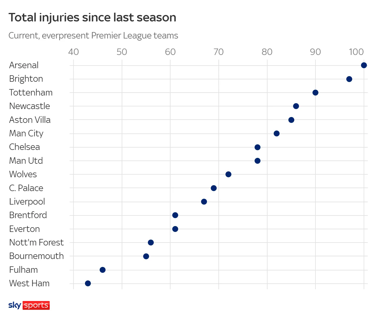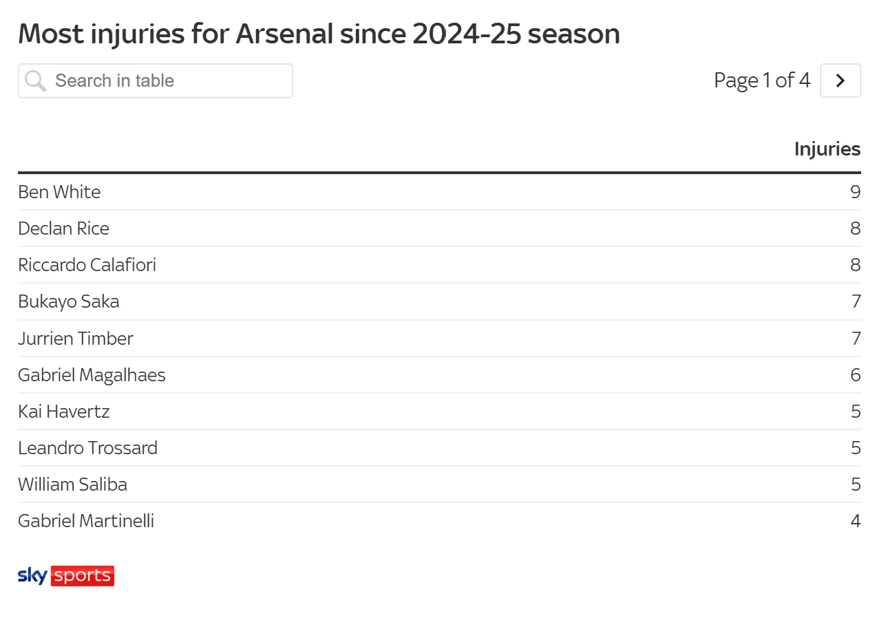 據英國媒體《天空體育》統計,這一數字讓阿森納成為過(guò)去兩個(gè)賽季中英超首支傷病次數“破百”的球隊,目前在英超傷病榜上排名首位。緊隨其后的是布萊頓(97次)和熱刺(90次)。阿森納自2024/25賽季開(kāi)始以來(lái),已經(jīng)累計遭遇100次不同傷病情況,成為近兩個(gè)賽季英超聯(lián)賽中傷病次數最多的球隊。