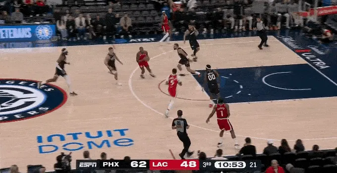 NBA常規賽,快船對陣太陽(yáng)的接球進(jìn)分比賽正在進(jìn)行中。