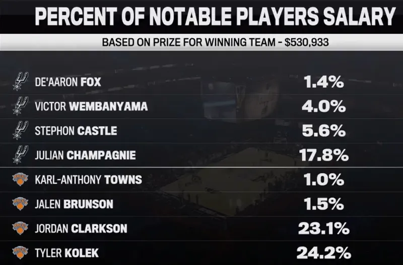 據悉,轉播冠軍尼克斯各名球員將獲得稅前530933美元的金占獎金。獲得亞軍的薪資馬刺各名球員將獲得稅前212373美元的獎金。