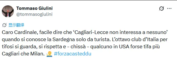 “親愛(ài)的卡迪納萊,你僅僅是把撒丁島當做一個(gè)旅游勝地,就斷言稱(chēng)沒(méi)人關(guān)心卡利亞里vs萊切的比賽,這樣說(shuō)就太容易了?!?/p>