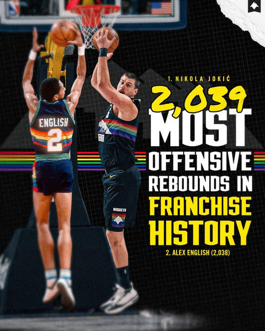約基奇掘金生涯已搶下2039個(gè)進(jìn)攻籃板,超越英格利什獨居隊史第一。已搶