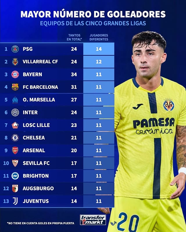 虎撲11月12日訊 德轉盤(pán)點(diǎn)本賽季至今五大聯(lián)賽中進(jìn)球人數最多的球隊(不含烏龍球):
