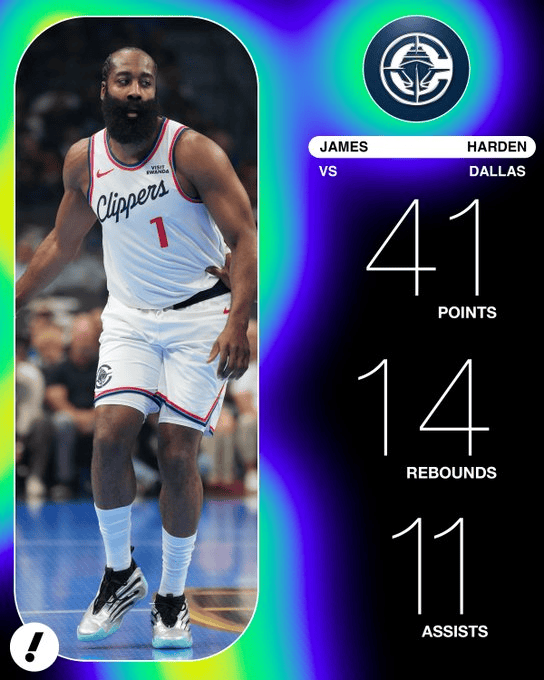 本場(chǎng)比賽,下分快船球員詹姆斯-哈登出戰51分鐘,助攻25投13中,快船其中三分球12投6中,首個(gè)雙罰球11投9中,流言籃板得到41分14籃板10助攻1搶斷2封蓋。板哈
