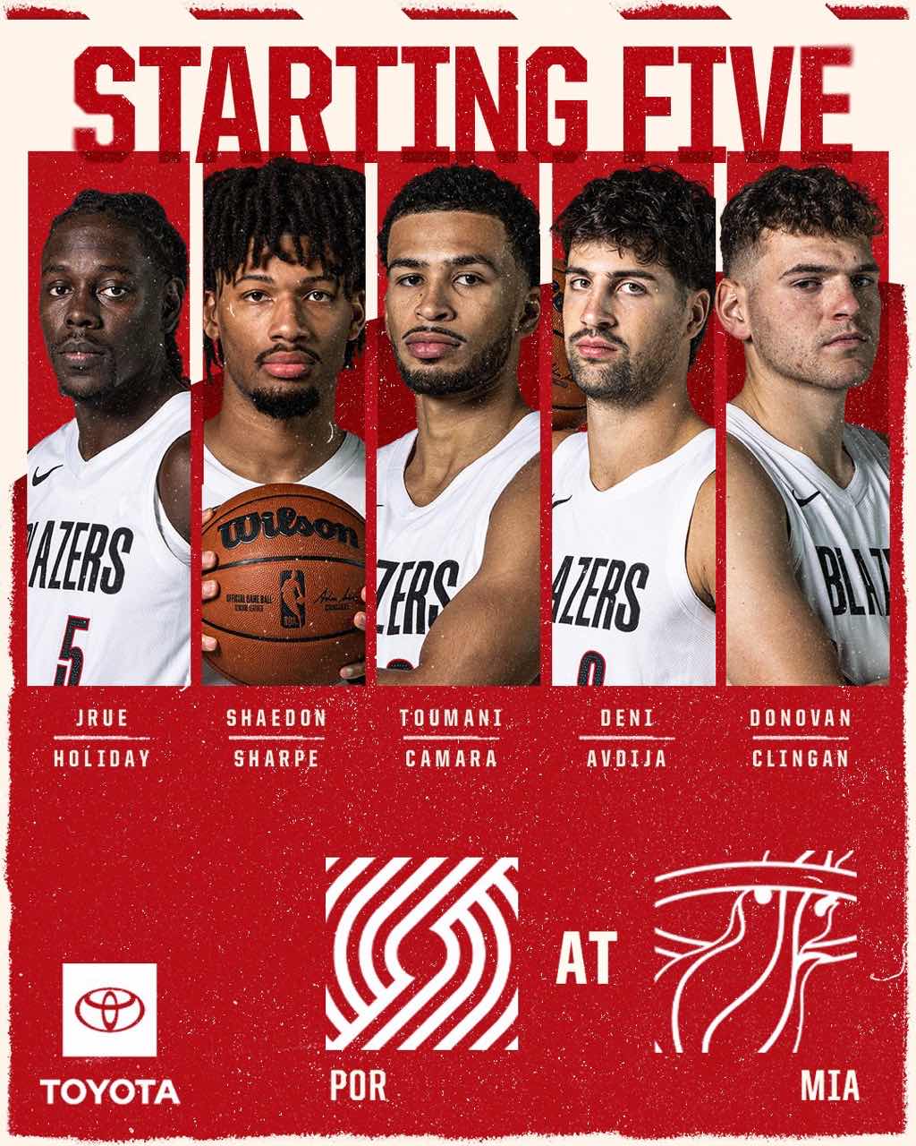 開(kāi)拓者賽前公布本場(chǎng)首發(fā):朱-霍勒迪、迪夏謝登-夏普、德尼-阿夫迪亞、圖馬尼-卡馬拉、多諾萬(wàn)-克林根。
