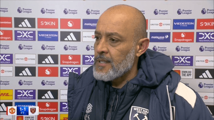 虎撲12月05日訊 西漢姆主教練努諾-桑托在1-1絕平曼聯(lián)的賽后,接受天空體育和BBC采訪(fǎng)。