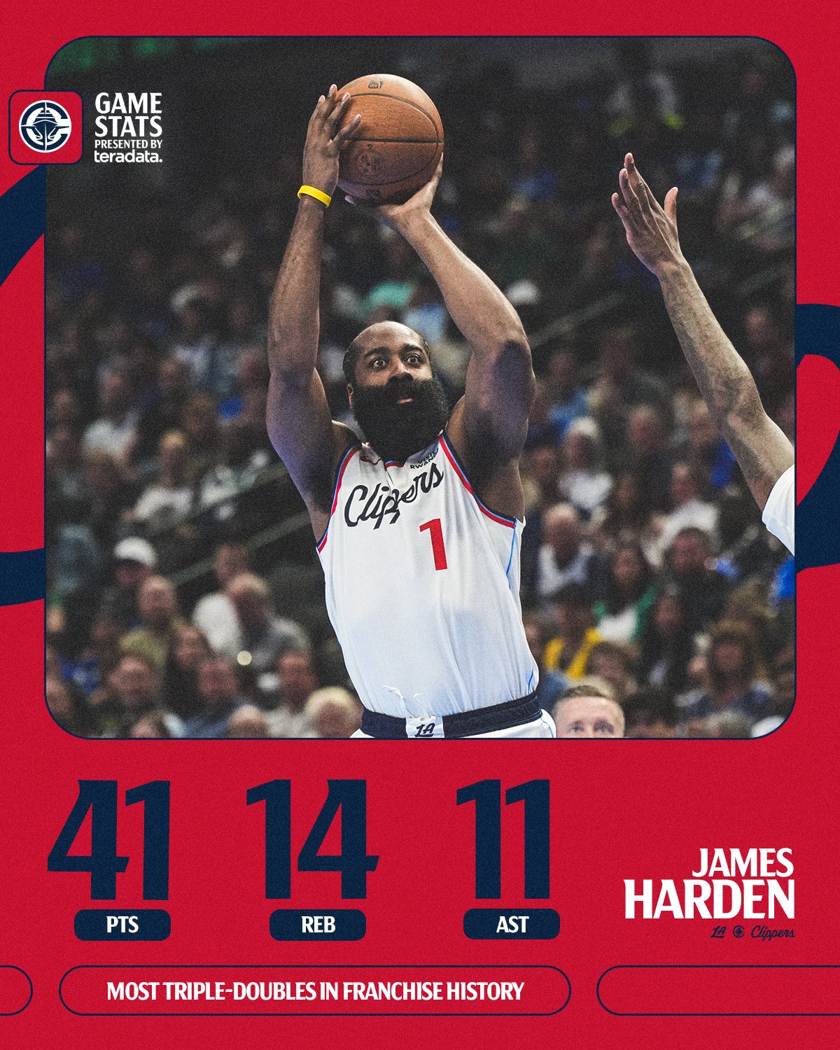 [流言板]隊史第一個(gè)取得40+三雙的球員!快船社媒曬哈登個(gè)人驚艷數據