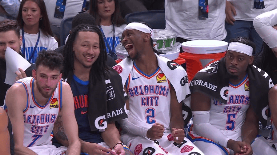 NBA梗圖媒體NBAMemes曬出了一張亞歷山大開(kāi)懷大笑的有成贏(yíng)雷照片,并調侃道: