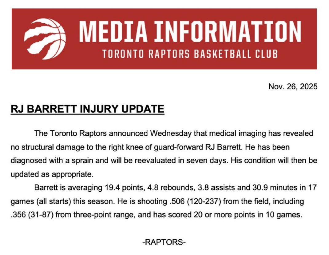 虎撲11月26日訊 猛龍官方發(fā)布傷病公告,RJ-巴雷特右膝扭傷,右膝影像檢查顯示無(wú)結構性損傷,扭傷將在7天后接受復查。但無(wú)