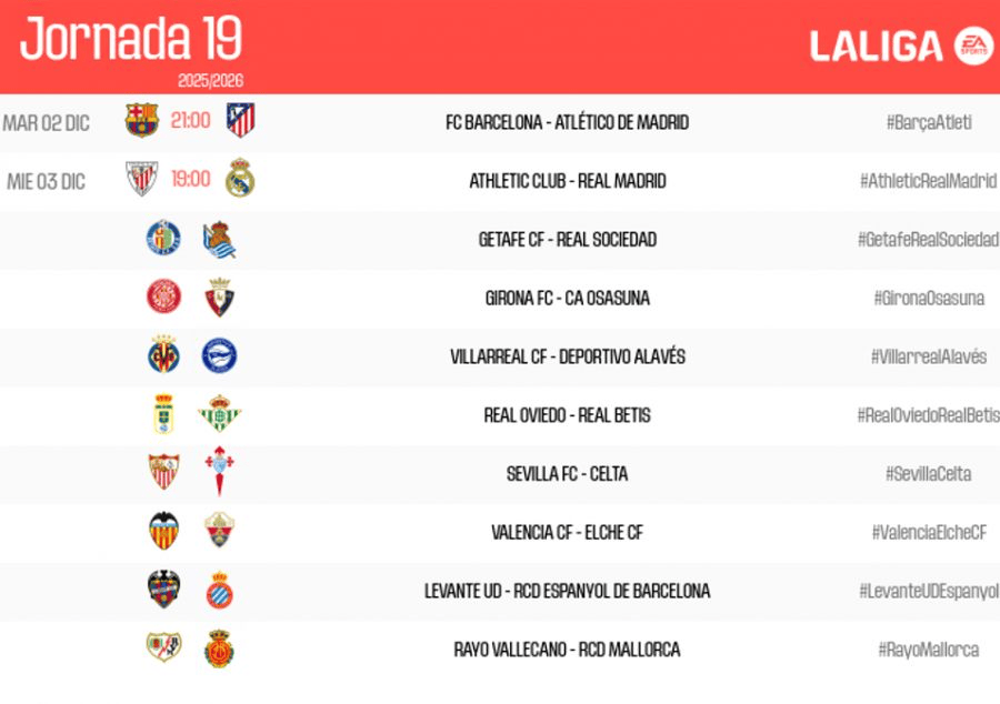 虎撲10月29日訊 LALIGA提前公布了西甲第19輪兩場(chǎng)比賽的安排,涉及球隊為參加西超杯的超杯4支球隊:巴塞羅那、皇家馬德里、強第前巴馬德里競技和畢爾巴鄂競技。流言輪提