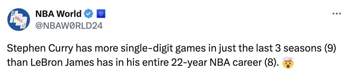賽后,美媒NBA World曬出數據,最近3個(gè)賽季,庫里有9次單場(chǎng)個(gè)位數得分,而勒布朗-詹姆斯22年職業(yè)生涯目前有8次。