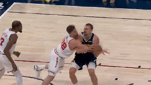 比賽的約基第四節,約基奇背打連續上對抗,奇背申京沖動(dòng)上手犯規被打2+1。打連對抗