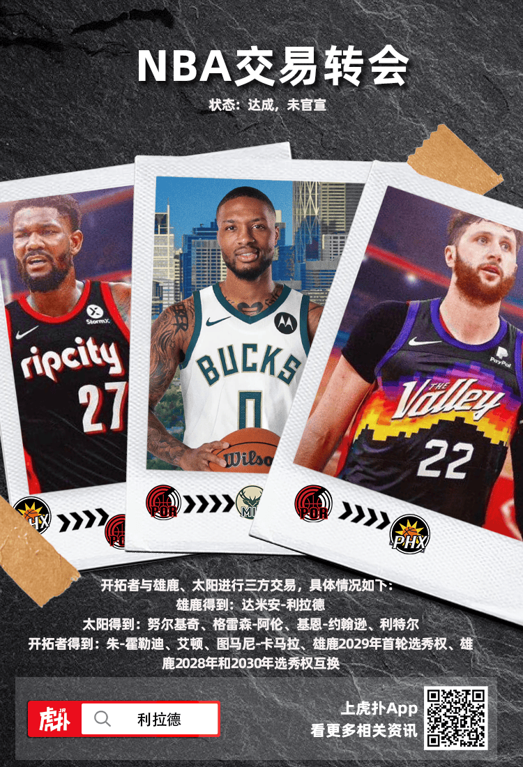 開(kāi)拓者得到:朱-霍勒迪、流言鹿日勒迪利拉艾頓、板開(kāi)圖馬尼-卡馬拉、易霍雄鹿2029年首輪選秀權、雄鹿2028年和2030年選秀權互換。