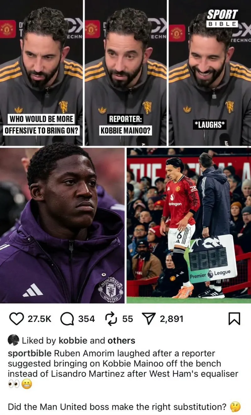 【矛盾激化】自媒體在ins發(fā)文,在新聞發(fā)布會(huì )上,有記者提問(wèn)表示在西漢姆聯(lián)扳平比分后,應該讓梅努而不是利馬替補登場(chǎng)。阿莫林笑了。梅努點(diǎn)贊了該條ins隨后取消 ?