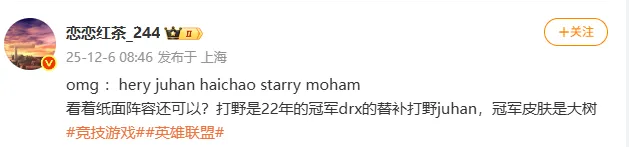 omg :hery juhan haichao starry moham看著(zhù)紙面陣容還可以?打野是22年的冠軍drx的替補打野juhan,冠軍皮膚是海超大樹(shù)